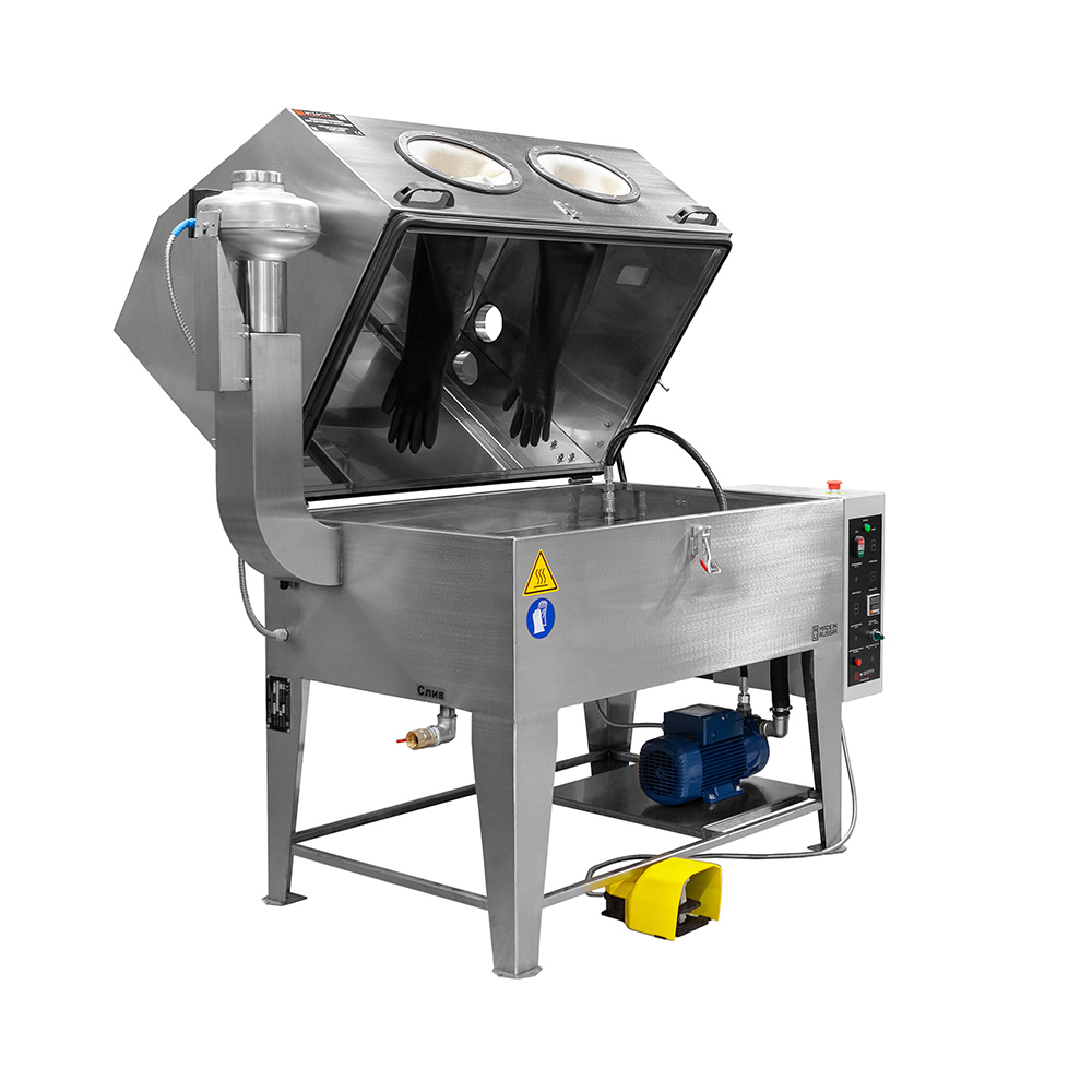 Представляет собой закрытый корпус со смотровым окошком, подсветкой рабочей зоны и системой подачи раствора с педальным управлением. Очистка изделий в ручном режиме позволяет максимально качественно обработать поверхности со сложной геометрией и глухие отверстия. Управление с помощью педали позволяет упрощать работу оператора и значительно экономить энергию, поскольку насос используется только при необходимости.
